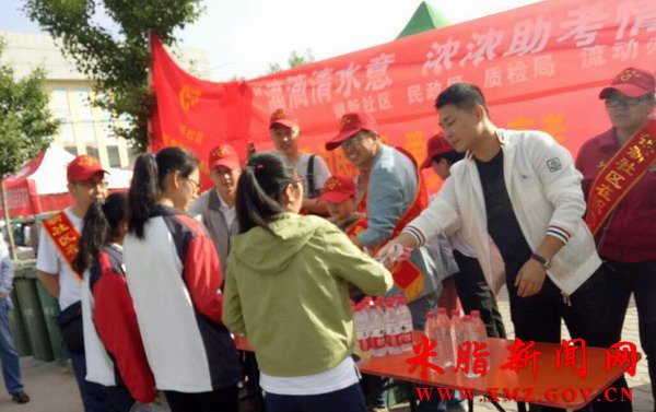 在一年一度高考之际,为了表达对莘莘学子的关心和支持,为其考试助力加油,银新社区党支部组织社区民政局、质监局和流动办的二十多名在职党员志愿者在县新二中考点开展了“滴滴清水意,浓浓助考情”爱心送水活动,并为考生家长提供乘凉点及其他力所能的帮助。 7日上午七点半,参加活动的在职党员们挂横幅,搬桌子,摆放水,忙得不亦乐乎。上午考试结束后,志愿者们为高考学子和家长送上一瓶瓶矿泉水,并衷心祝福考生取得优异的成绩。虽然只是一瓶普通的水,但是饱含着党员志愿者们对高考学子的关爱和支持。